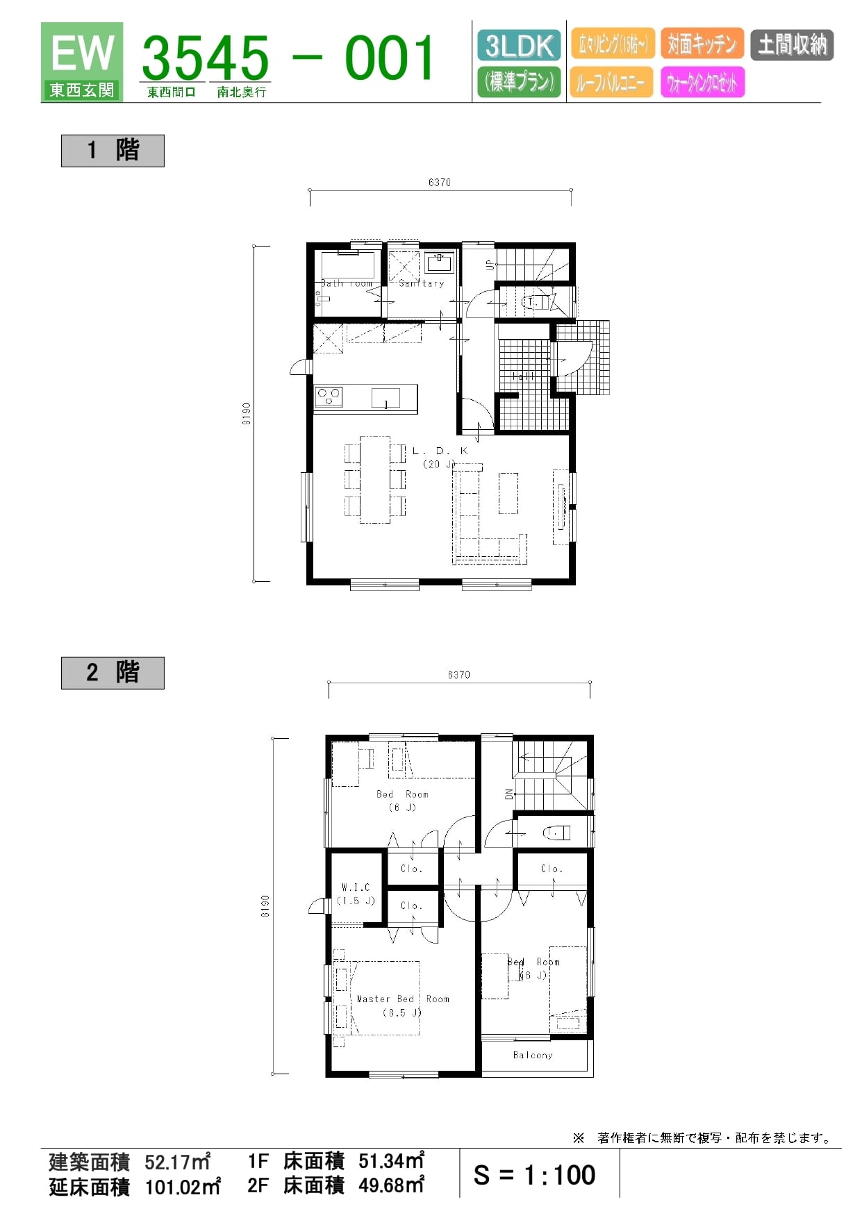 東(西)玄関 6.37m×8.19m の間取り No.1